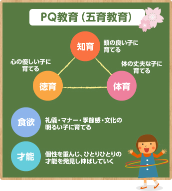 IQ教育(知識)のみの教育から、PQ教育(知恵)も使う子どもたちへ・・・。まず心と身体の真育に力を注ぐ事を大切に考えています。(知育・徳育・体育の三育教育)大事なことは、それぞれのポイントを高めることではなく、バランス良く伸ばしてあげることなのです。そしてさらに礼儀・マナー・季節感・文化の明るい子に育てる「食育」。個性を重んじ、一人一人の才能を発見し伸ばして行く「才育」。いわゆるPQ教育へと発展し、お子様の無限の可能性を引き出していきます。