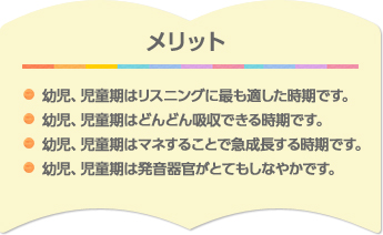 幼児期は発音器官がすごくやわらかい時期です。英語のむずかしい発音やイントネーションの違いなどは、幼児期に吸収させないとダメだと言われています。模倣能力が最高の2歳~6歳の子どもは、あらゆる言語の音を聞き分け、発することができます。英語特有の発音やリズムを生活の中で自然に習得するのはこの時期が最適です。